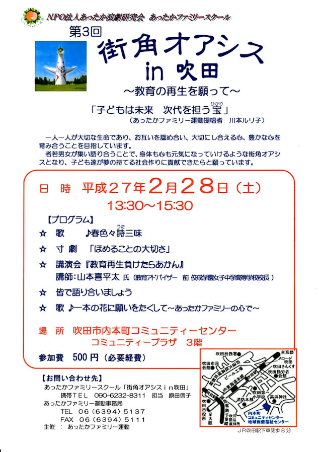 当、吹田子ども支援センターのサポータである、山本喜平太先生が、NOPあったかファミリースクール主催の第3回街角オアシスin吹田2月28日土曜日に「教育再生負けたらあかん」(仮称)【吹田市教育委員会後援】と題して講演されます。是非ご覧ください。詳しくは、ココをクリックしてください。